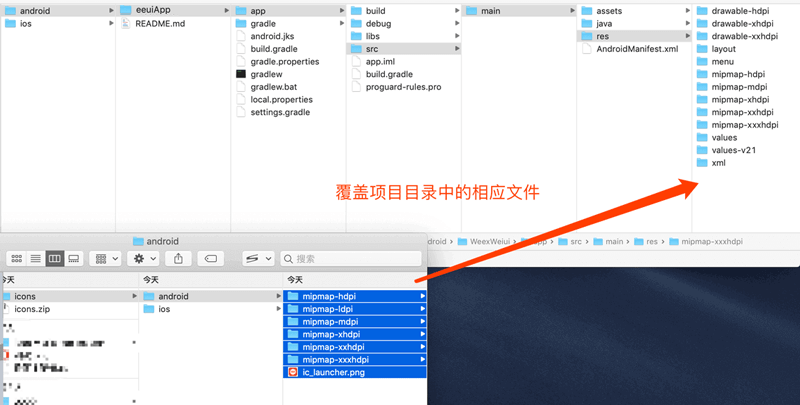 Android覆盖路径为:platforms/android/eeuiApp/app/src/main/res/mipmap-xxxx/