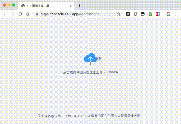 打开图标生成工具https://console.eeui.app/#/tools/icons (opens new window)上传并生成图片