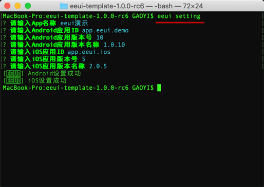 在项目根目录执行以下命令即可按提示完成App名称、版本号等相关设置。